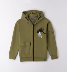 Il modello ha apertura frontale con zip e bottoni, cappuccio staccabile.